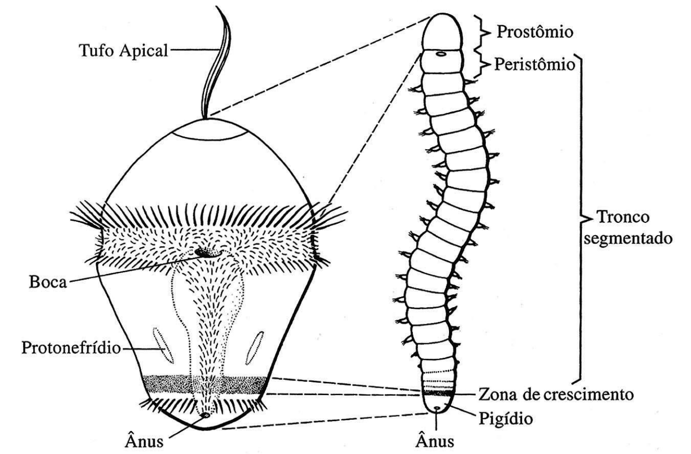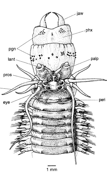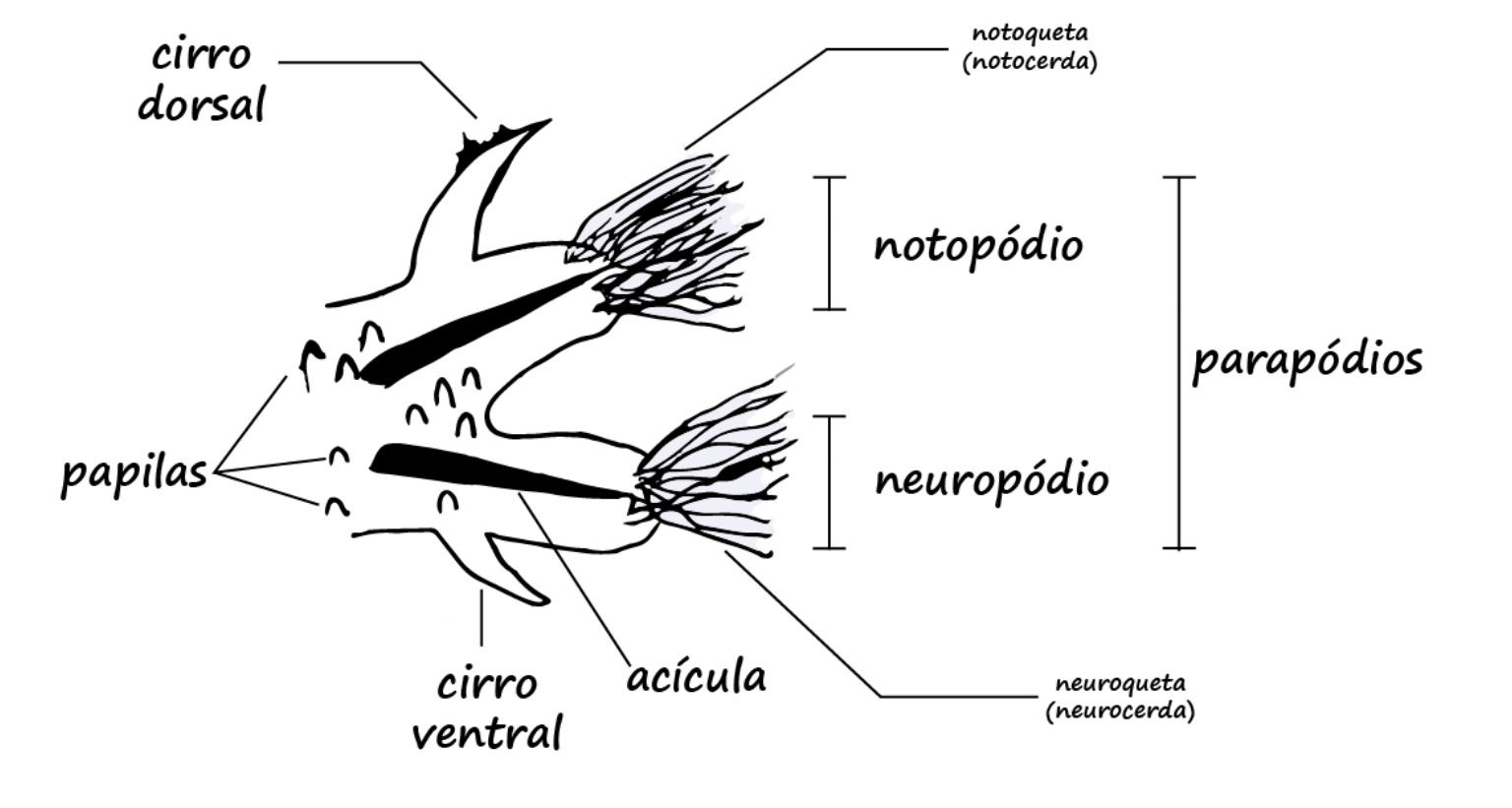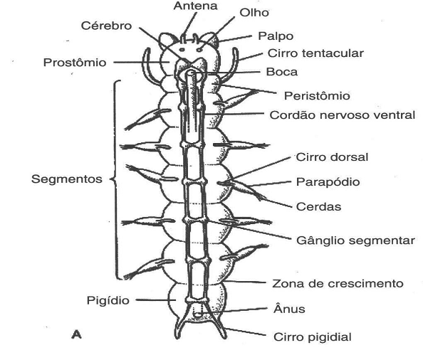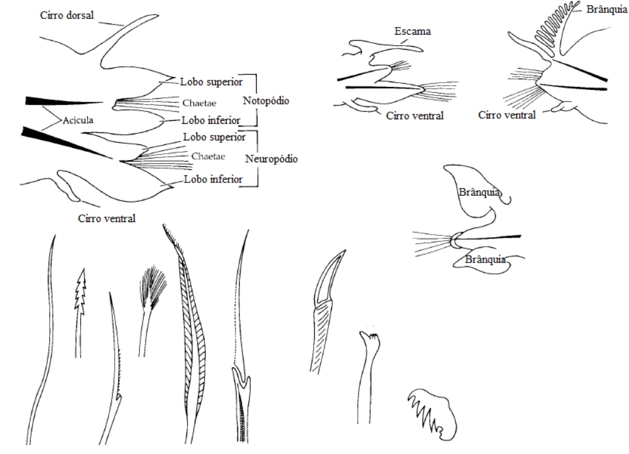 Prostômio = “cabeça”, onde estão os olhos, as antenas e os palpos.Peristômio = primeiro segmento, de onde saem os cirros tentaculáres.Parapódios = projeções laterais em cada segmentocerdas = setas de diversos tiposPigídio = último segmento, contendo o cirro pigidial.Brânquias presentes nos parapódios ou prostômio.Errantia