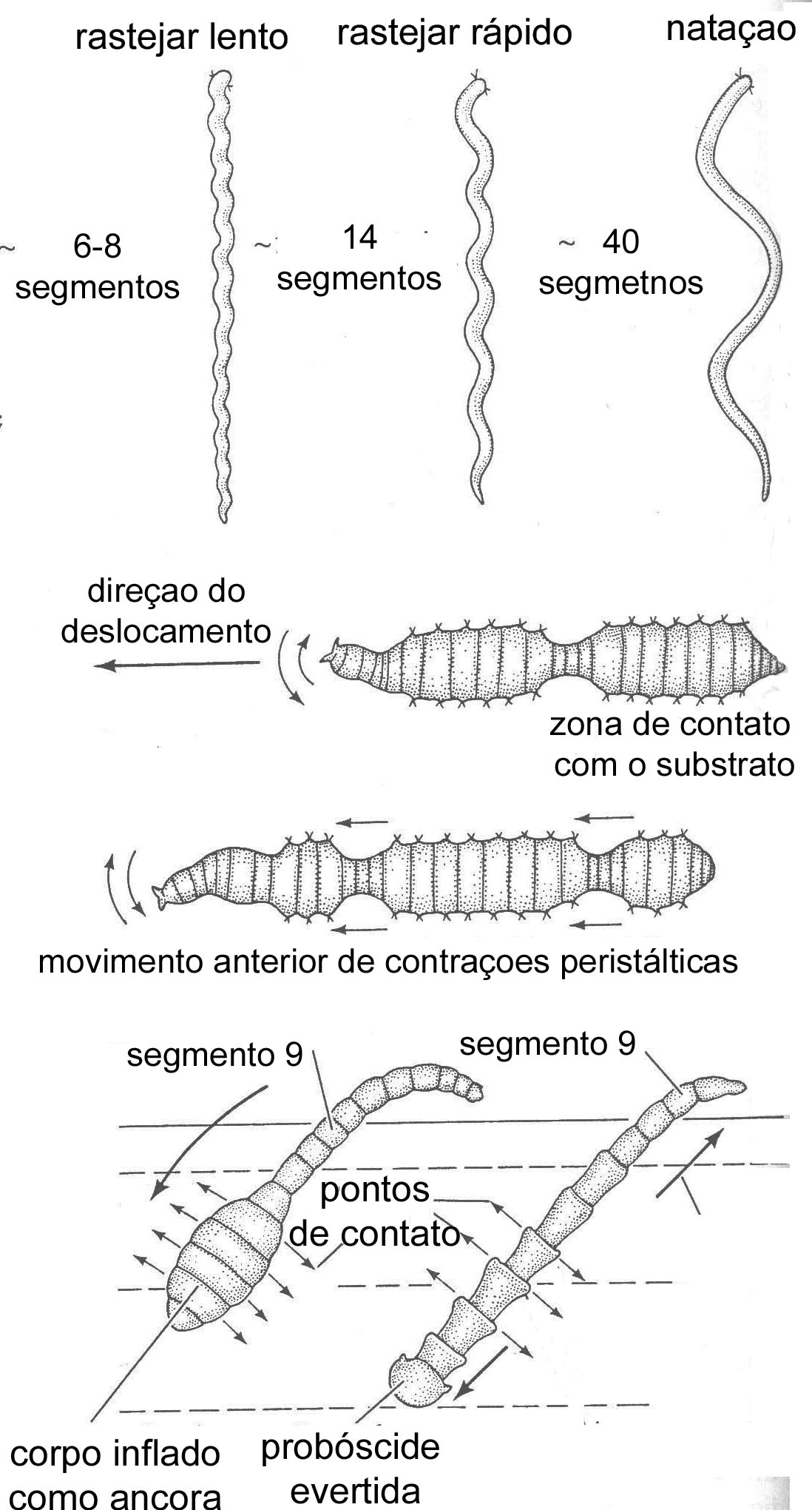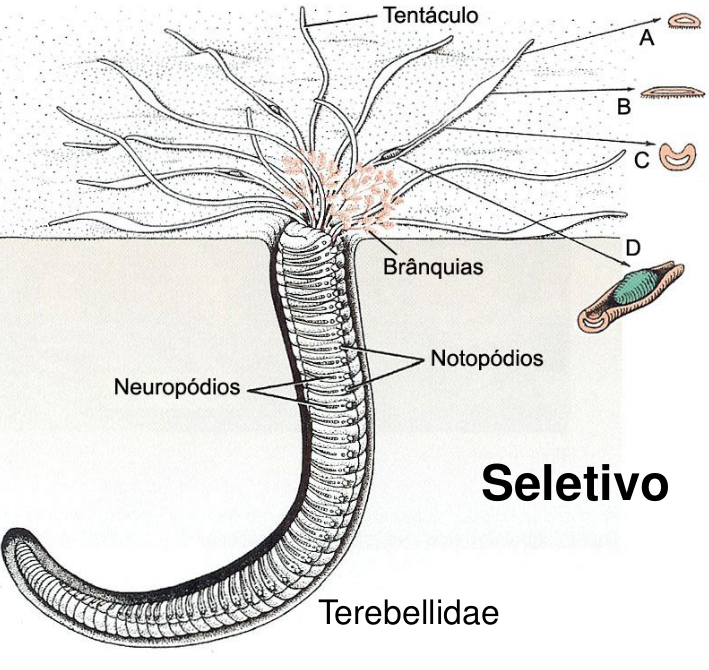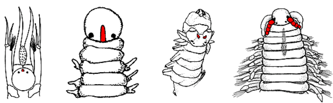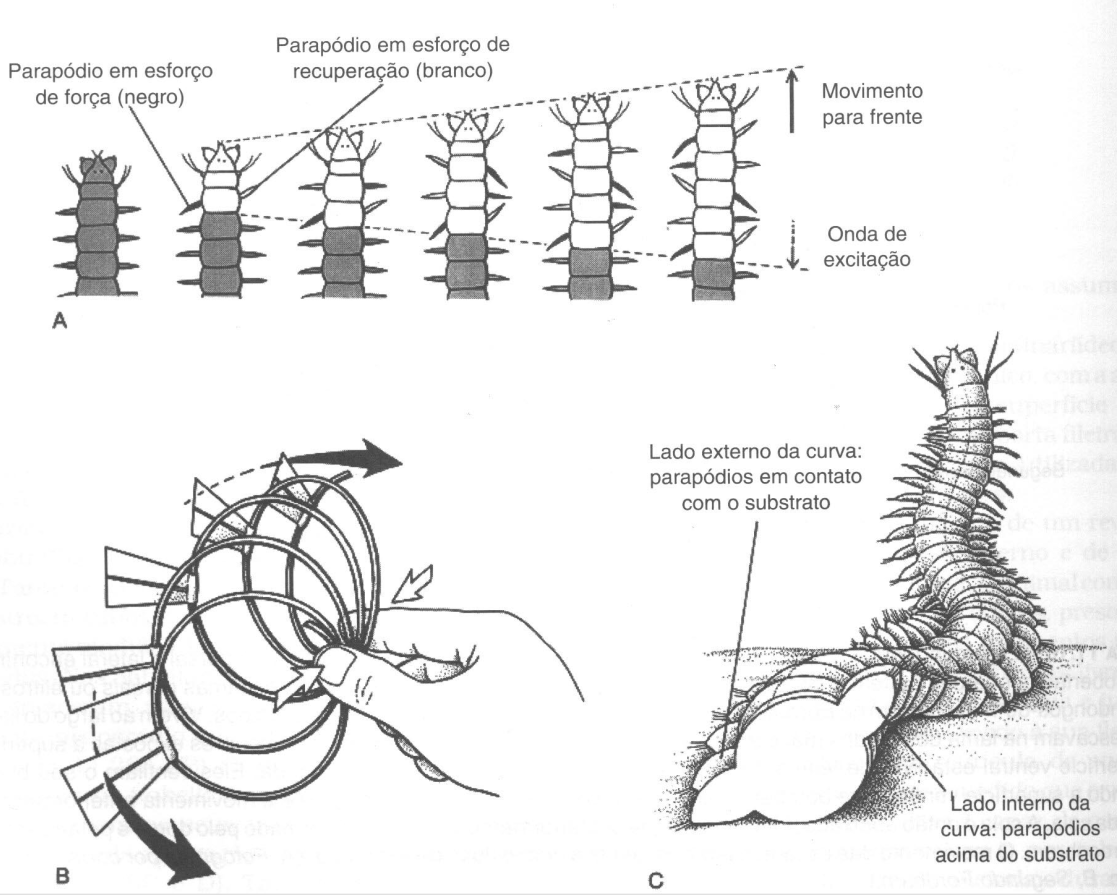 Prostômio = “cabeça”, onde estão os olhos, as antenas e os palpos.Peristômio = primeiro segmento, de onde saem os cirros tentaculáres.Parapódios = projeções laterais em cada segmentocerdas = setas de diversos tiposPigídio = último segmento, contendo o cirro pigidial.Brânquias presentes nos parapódios ou prostômio.Errantia